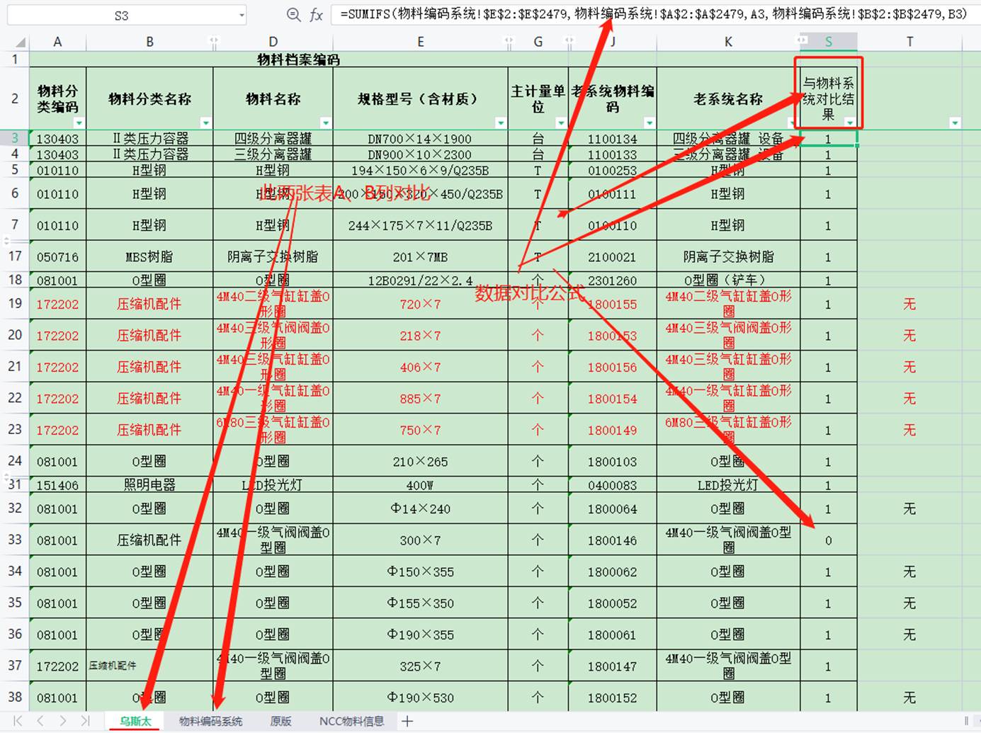 在結(jié)果值返回表(烏斯太)中設(shè)公式:S3=SUMIFS(物料編碼系統(tǒng)!$E$2:$E$2479,物料編碼系統(tǒng)!$A$2:$A$2479,A3,物料編碼系統(tǒng)!$B$2:$B$2479,B3)。